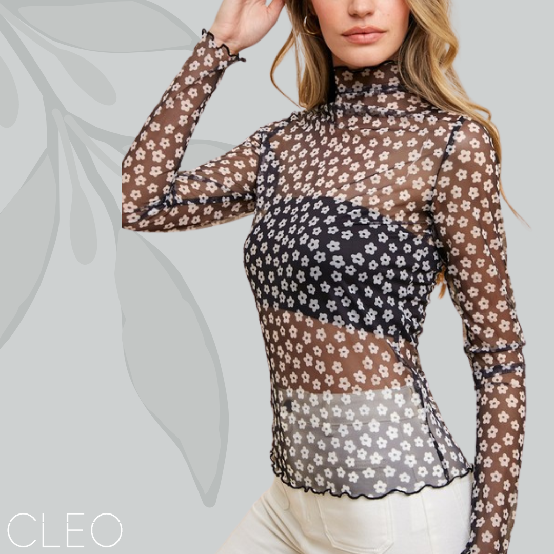 Blusa negra de mesh estampada con flores blanca, cuello alto, manga larga , material strech( no incluye top)