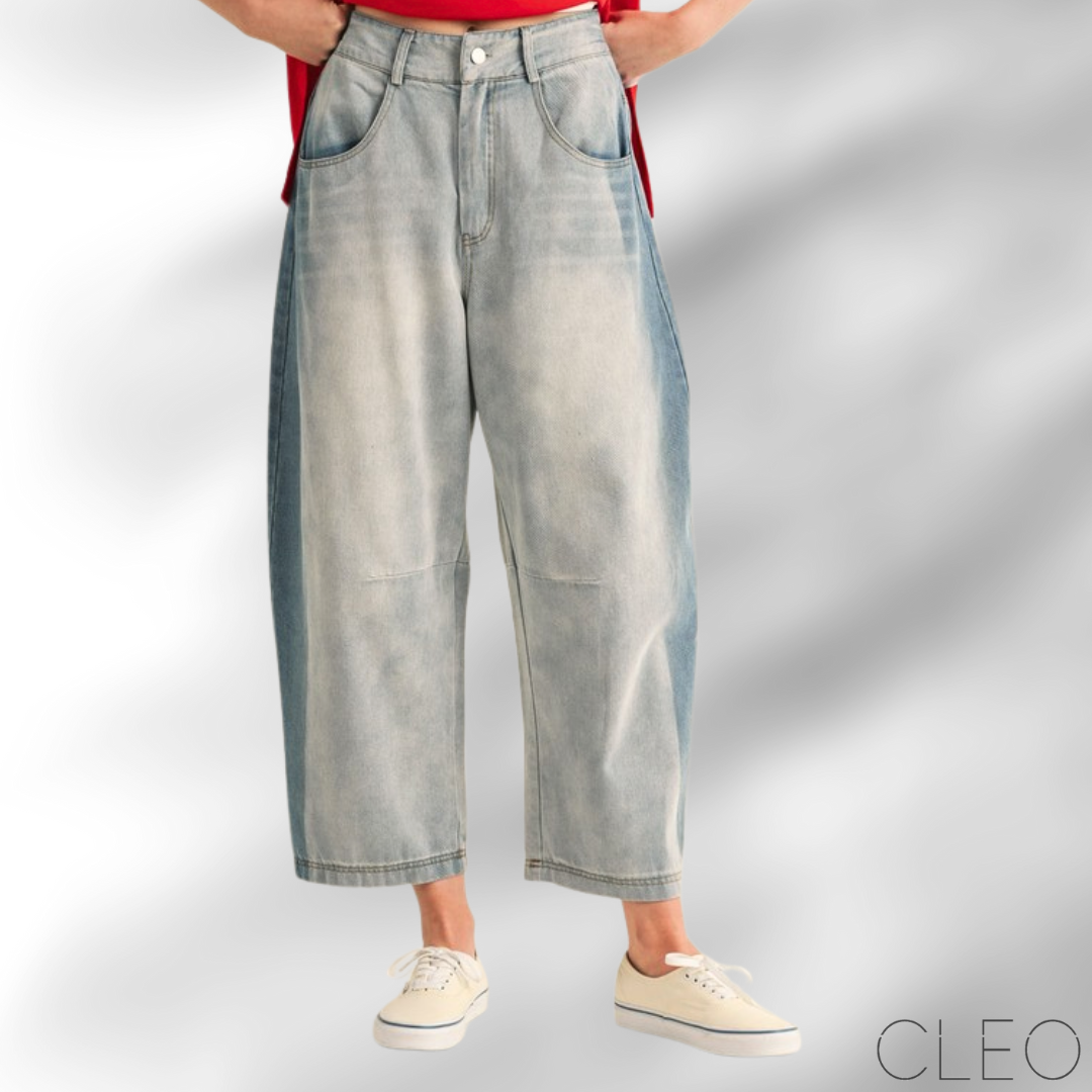 Jeans en dos tonos, balón wide leg, cortos, denim liviano, cintura elástica en la parte trasera