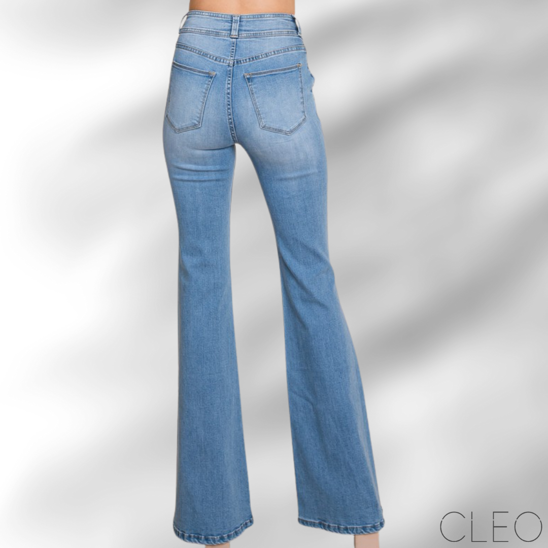 Jeans celeste flare, cintura alta , bolsas laterales, doble botón, strech.