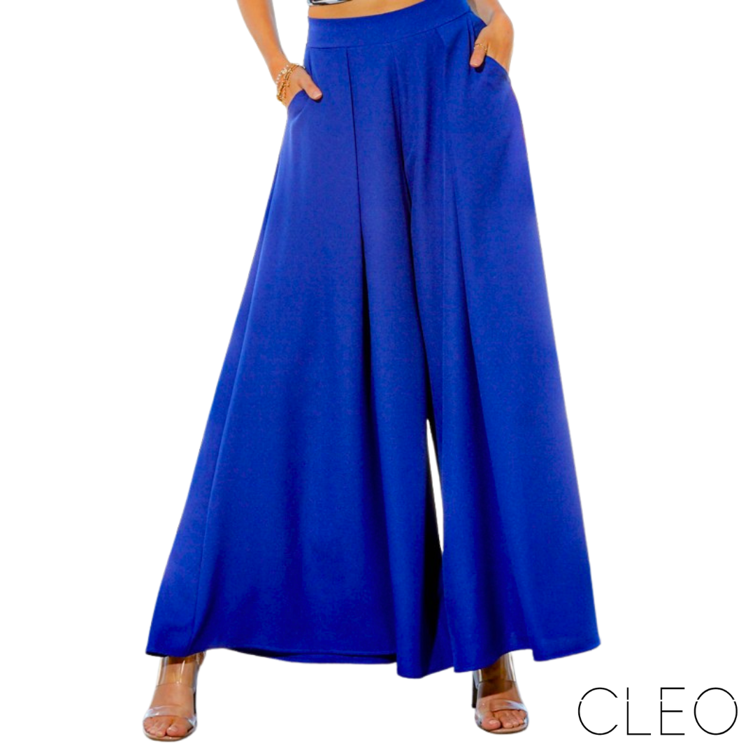 Palazzo azul rey, corte wide, cintura alta, bolsas laterales, ziper lateral. Material poliester.