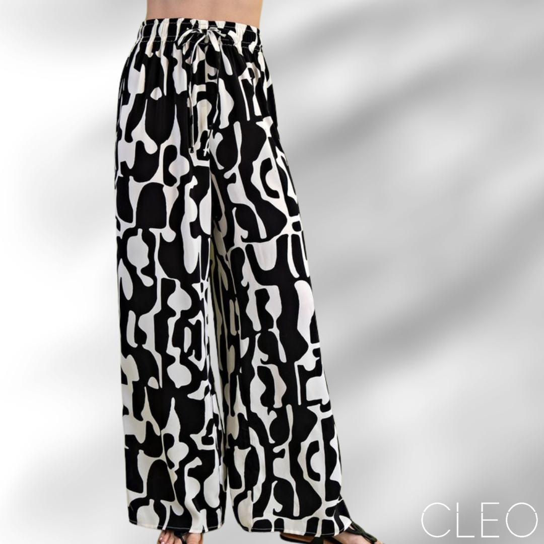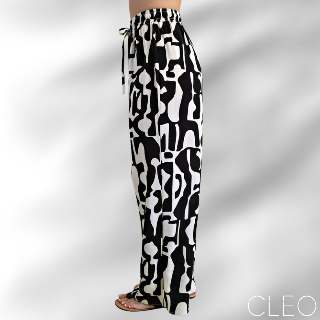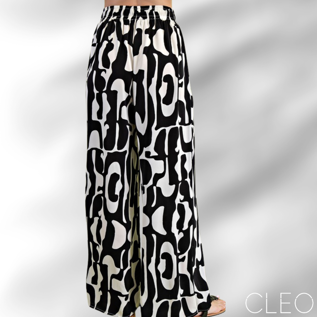 Palazzo estampado blanco y negro, cintura elástica alta, bolsas laterales.