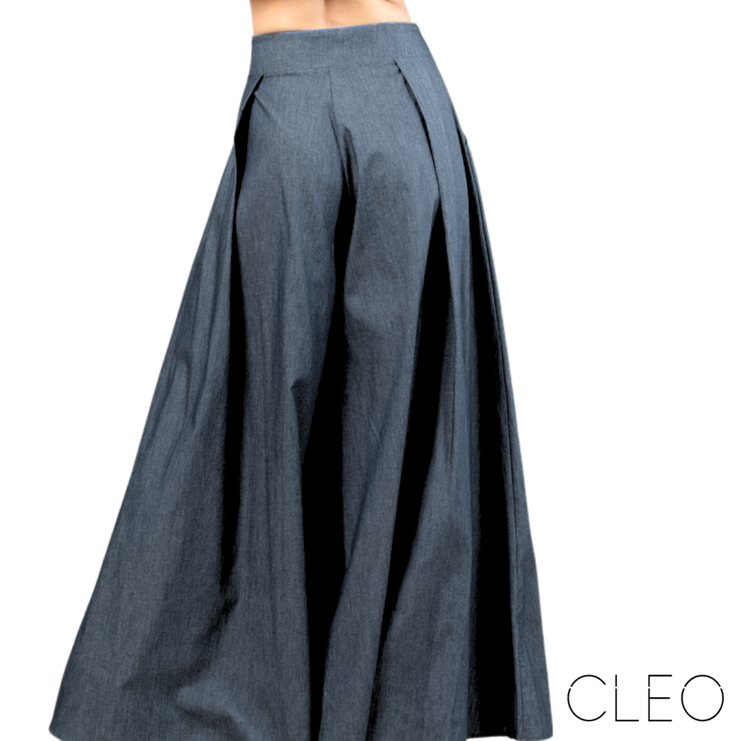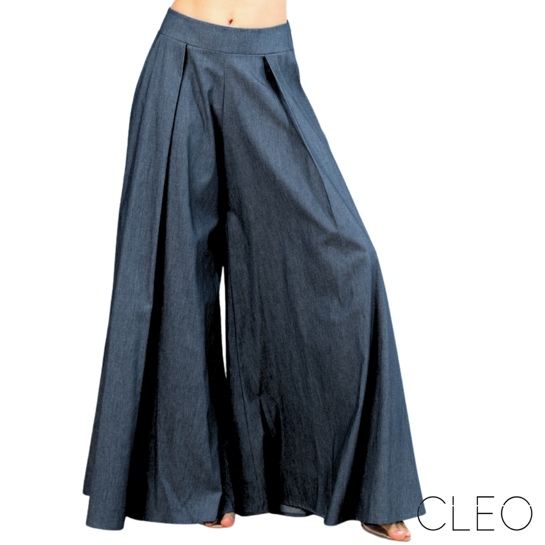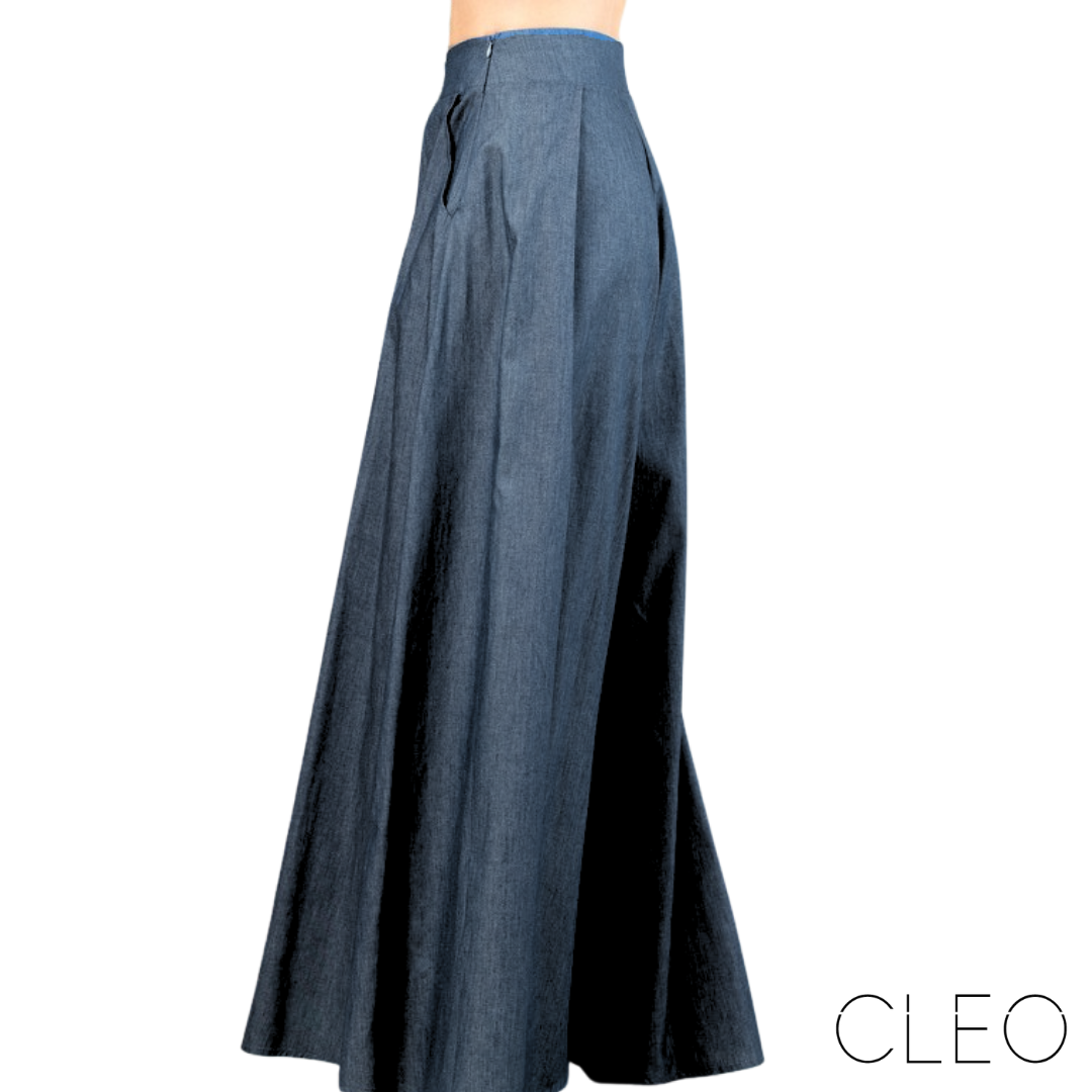 Palazzo de denim azul, corte wide, cintura alta, bolsas laterales, ziper lateral. Material denim.