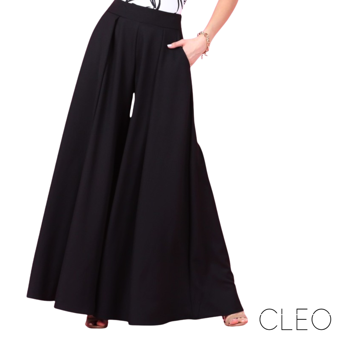 Palazzo negro, corte wide, cintura alta, bolsas laterales, ziper lateral. Material poliéster.