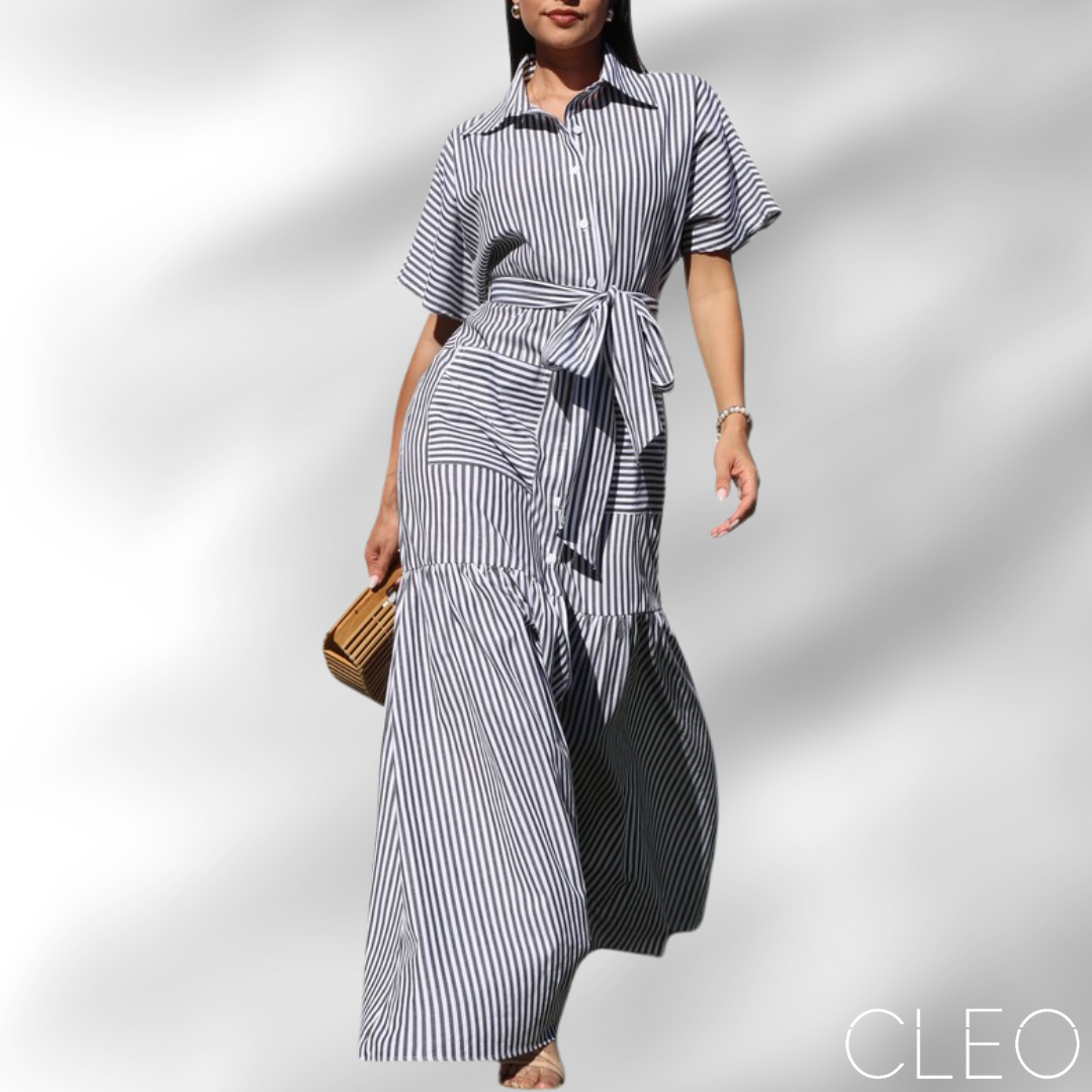 Vestido maxi de rayas grises y blanca, corte en capas, faja a la cintura, manga corta, bolsas frontales.