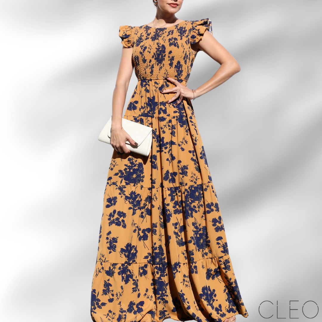 Vestido maxi estampado camel y azul navy, torso y cintura elástica, manga de vuelo, material super fresco.