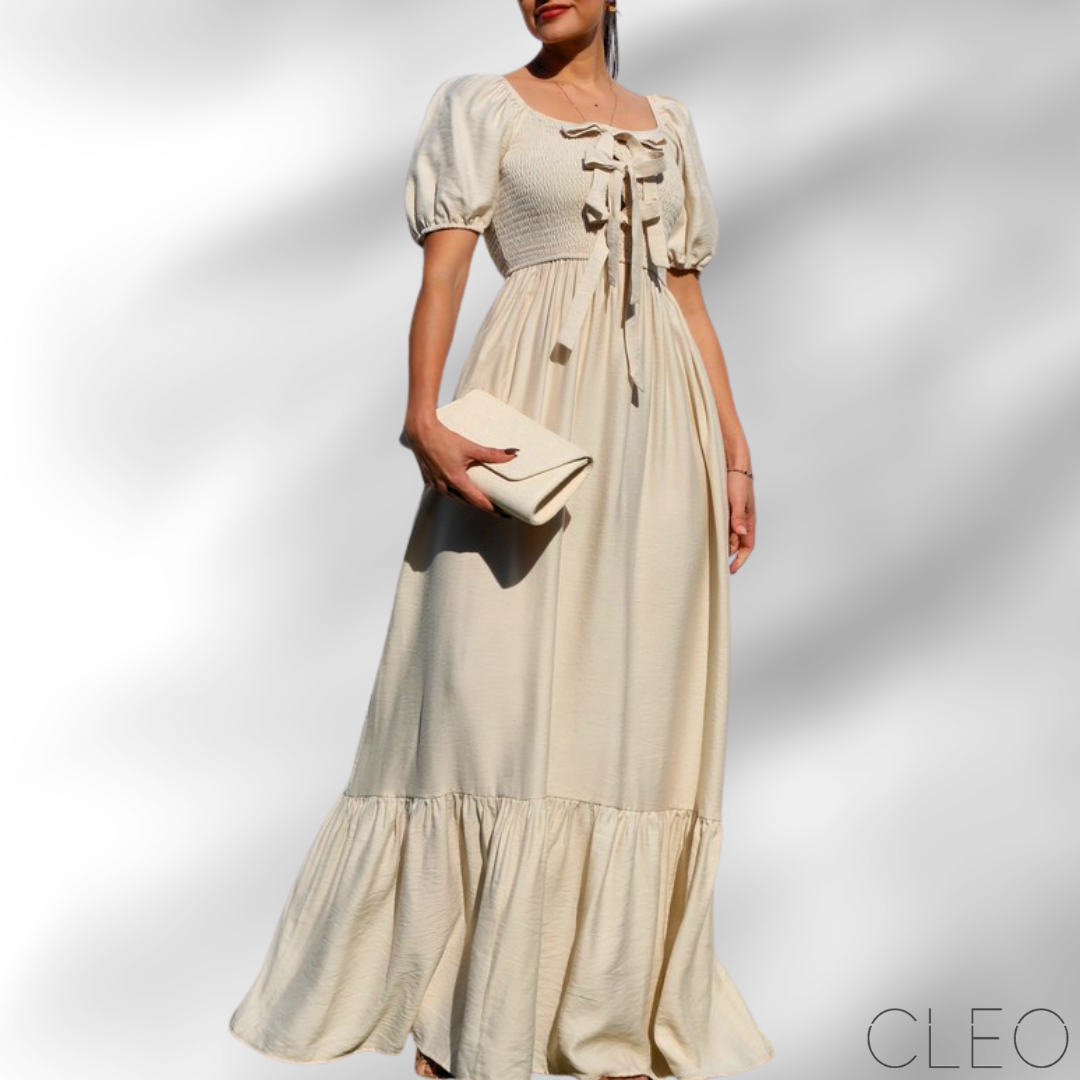 Vestido maxi nude, torso y cintura elásticos, manga puff, bolsas laterales, material fresco.